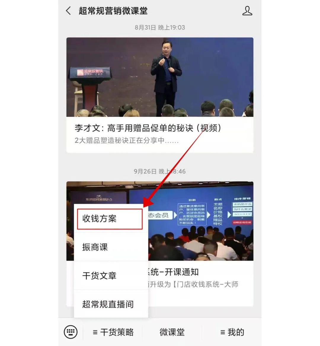 今后从哪里可以进入[门店收钱方案]栏目呢?进入【超常规营销微课堂】公众平台后,点击左侧最底部,出现的第一个就是它。